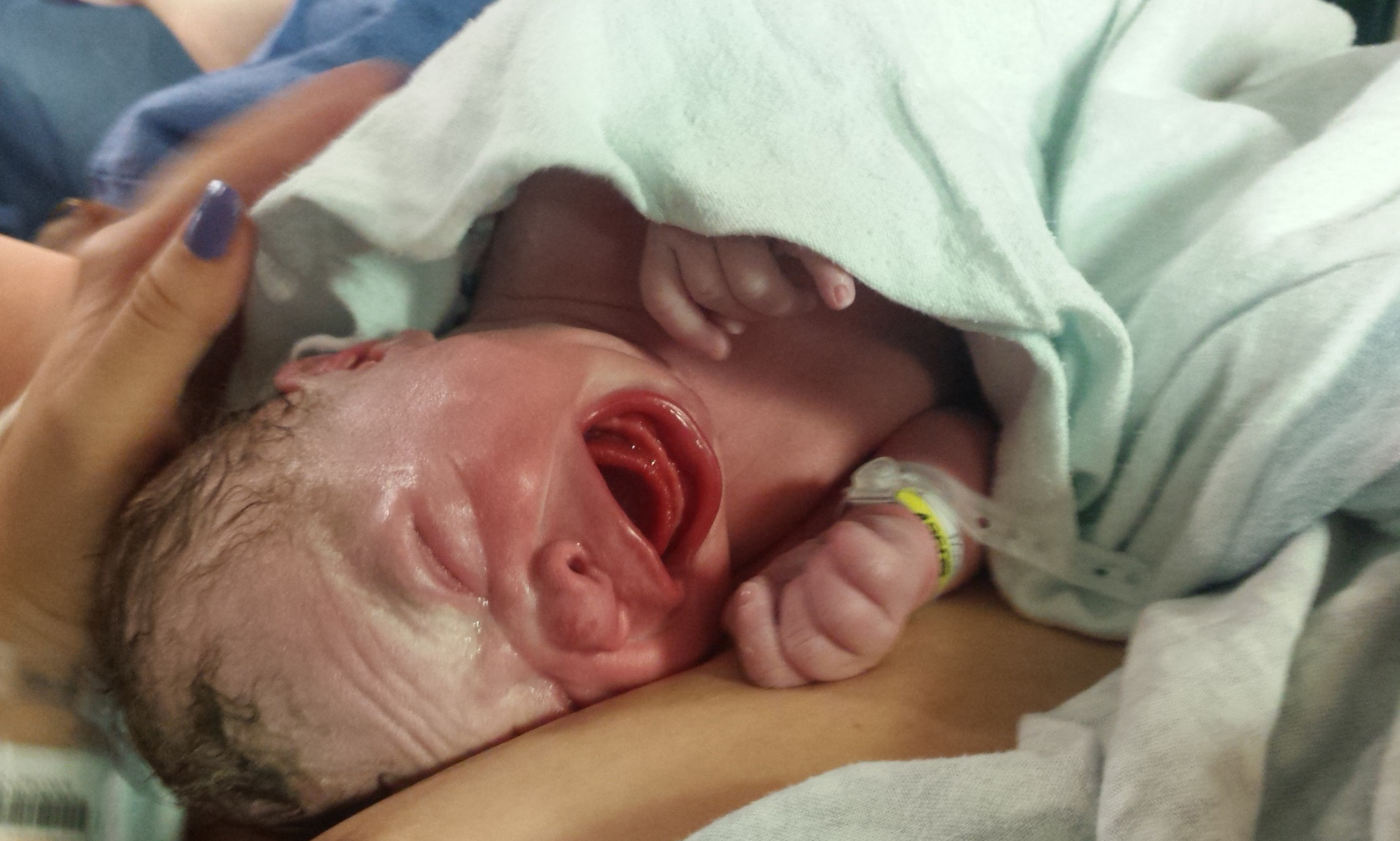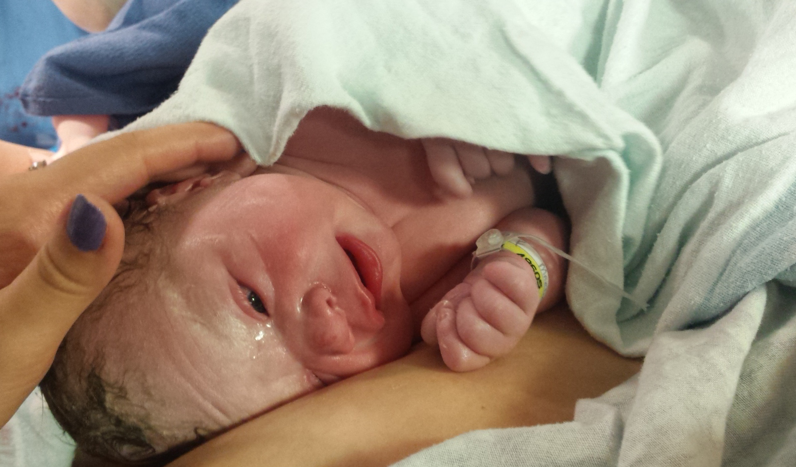 They all laughed. Dave and I started crying. They clamped the cord and Dave cut it. Then they cleaned her up a little and laid her on my chest. I’m so happy that Dave took a picture of what ended up being my first look at our daughter.