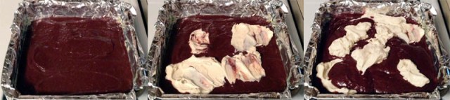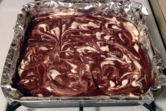 5. Add half the brownie batter to the pan, then a layer of the cream cheese mixture (next time I’ll make a thinner layer that is more evenly spread out), and then repeat until everything is in the pan.