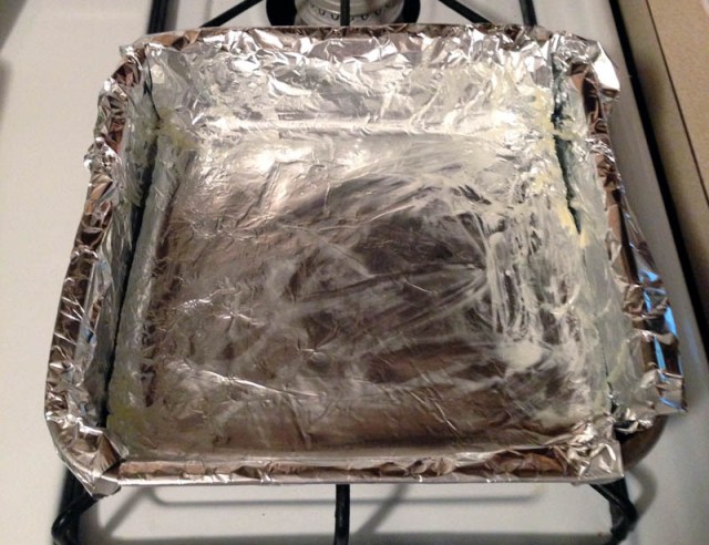 1.Preheat the oven to 350. Line an 8×8 pan with aluminum foil and butter the foil. (I saw this instruction in one of the recipes I read. It made transferring the brownies to the cooling rack wayyy easier.)