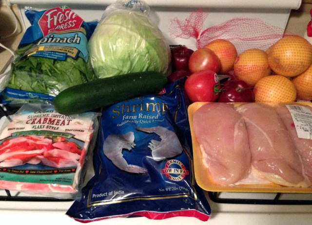 - Protein – Chicken, shrimp and crab meat. (And yes, I know farm-raised shrimp and imitation crab meat are bad. But those are two very cheap sources of protein that also happen to taste great, and it’s only for a few weeks.) I already had a few cans of tuna fish, so I didn’t need to buy any, though tuna will definitely be on the menu.