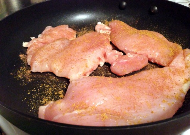 3. Add the chicken to the pan. (I cook the chicken over a really low flame for like 20-30 minutes to keep it as moist as possible.)