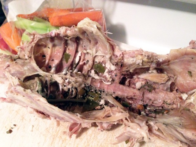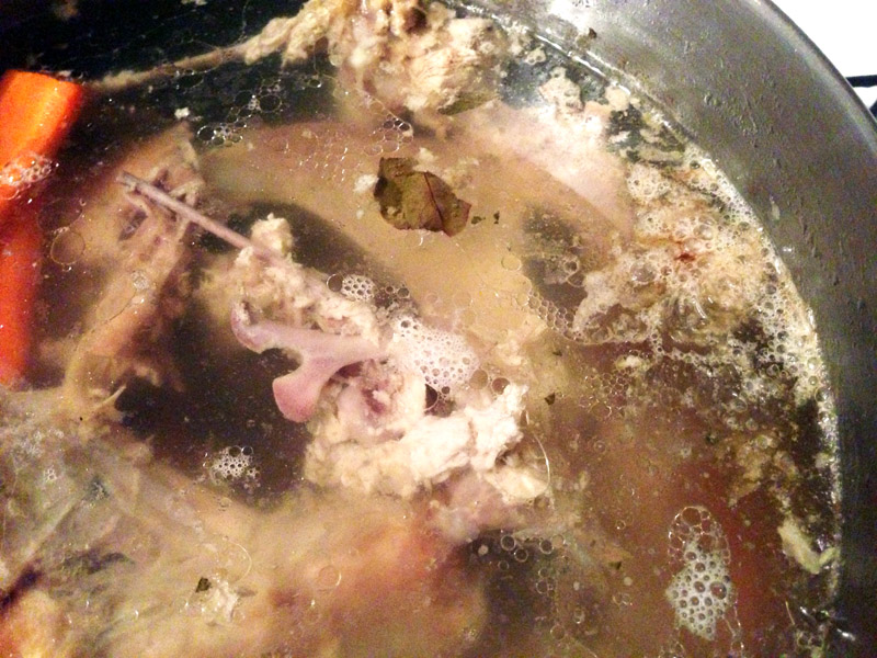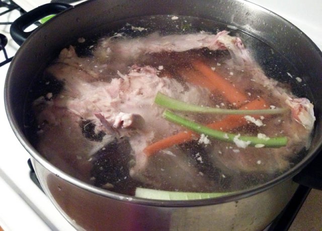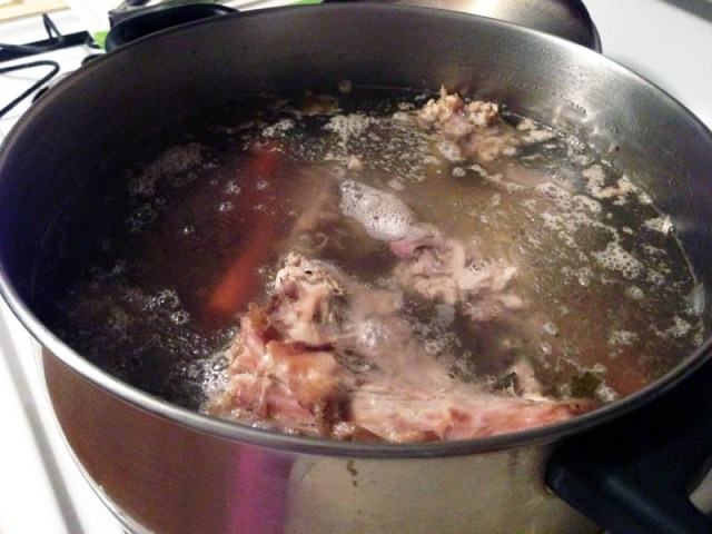1. Fill the pot with enough water so the carcass is covered. I had to use my hands to break the carcass into four smaller pieces in order for it to fit in my pot. I felt kind of savage when I did this, but in a good, “I could have survived as an American pioneer” type of way.