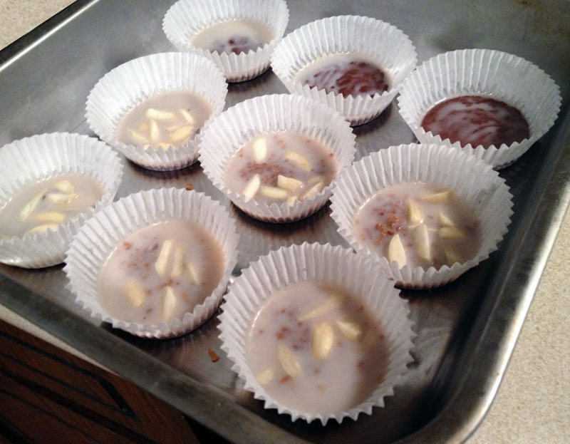 If you notice, in the bottom two rows you can really see the separation. By the time I got to the top row, most of the separated coconut oil had drained out, leaving me with a more solid chocolate mixture.