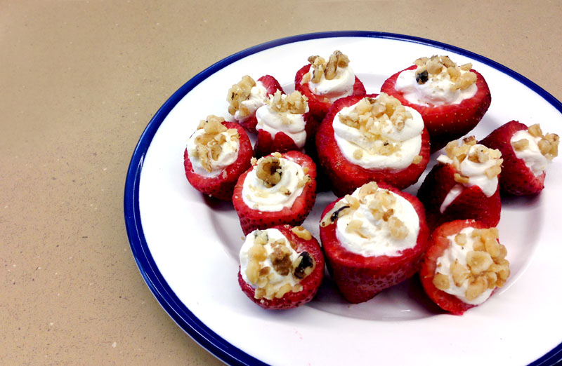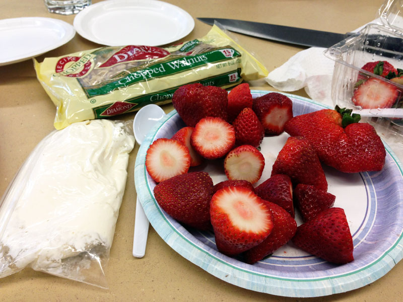 The scene at my table during lunch was kind of funny. I had plates, knives, napkins, a tray, strawberries, nuts, and the cheesecake mixture laid out in front of me. As I sat at the table cutting and scooping out the insides of the strawberries, my friend commented that she felt like she was watching a cooking segment on tv.
