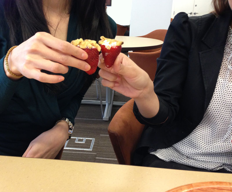 I would have been done with everything relatively quickly if I didn’t need to stop at every stage and take pictures for this blog! The “photo shoot” took a turn for the ridiculous when my friends started posing for pictures with the strawberries. I’m sure people in the lunchroom were wondering what the hell we were doing!
