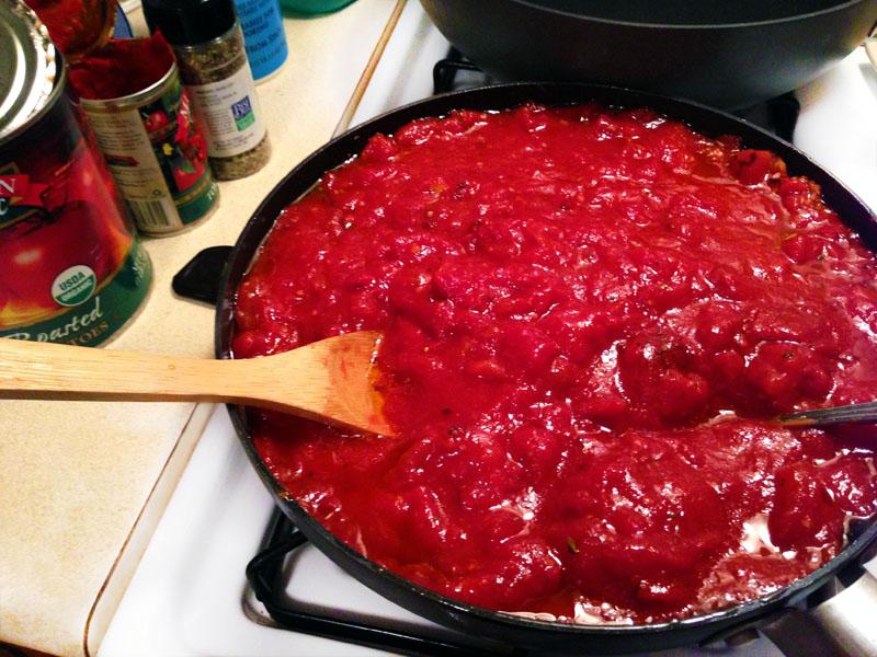This time I used fire-roasted tomatoes, because they were on sale. Initially I was only planning to use one can of tomatoes, but I accidentally poured out too much oil in the beginning so I decided to double the recipe. I learned awhile back that you should ALWAYS have extra cans of tomatoes when you’re making a sauce. That way, if you mess something up – too much oil or salt – all you have to do is add another can of tomatoes and Voila! Problem solved.