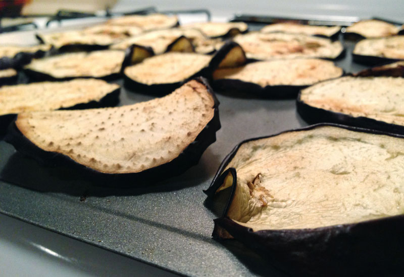 Preheat the over to 450F. Spray a baking sheet with olive oil spray (or something similar). Slice the eggplant into thin rounds, then place them on the baking sheet. Cook for about 15 minutes, flipping once about halfway through, until the slices begin to brown (I find that I prefer them when they’re crispier). Remove the eggplant from the oven and turn it down to 375F.