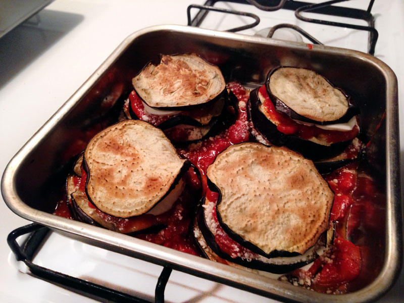 Take an 8×10 inch baking pan and spread out a thin layer of tomato sauce. (Why? I don’t know. My mom told me to do it, and I’ve since seen it in other recipes. Maybe it’s so the eggplant won’t stick to the pan?) Add a layer of eggplant. Over each eggplant slice, add some tomato sauce, then parmesan cheese (I do about one teaspoon per round, per layer), and then mozzarella cheese. Repeat until you’ve used all of the eggplant. I usually have three layers of eggplant.
