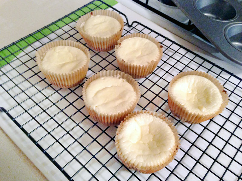 • You may notice in the photos below that some of the tops of the cheesecakes are a little sunken. Apparently this is common with cheesecakes and has to do with the moisture in the cake or something. This is why I put a water-filled pan in the oven while I’m cooking them. It’s a bootleg version of a water bath, and it helps a lot.