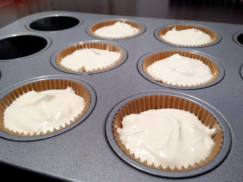 6. Pour the mixture on top of the cooled pie crust (or just straight into the cupcake liners if you’re skipping the crust).