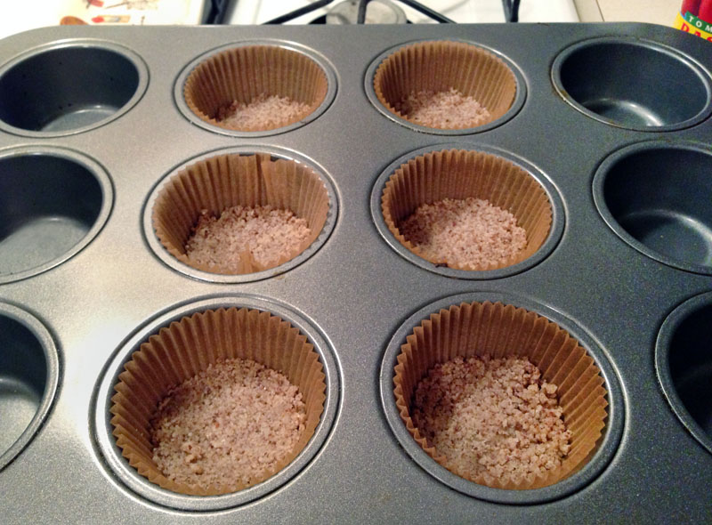 2. (Optional) Line your cupcake pan with liners (6) and scoop one tablespoon of the pie crust mixture into each one. Bake for approximately 10 minutes; let them cool before you pour the cheesecake mixture on top.