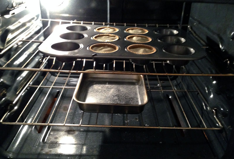 3. Place a pan filled with water onto the bottom shelf of the oven. (I did this AFTER I took the pie crust out. But if you’re not doing the pie crust, just put it in when you start preheating the oven.)