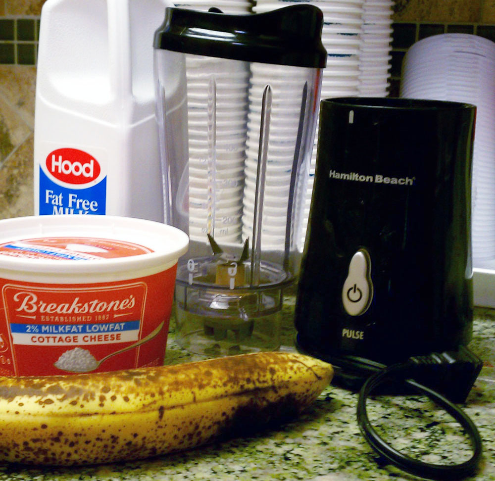 Mix everything in the blender. Sometimes I might add a packet of Truvia, depending on how sweet the banana is.