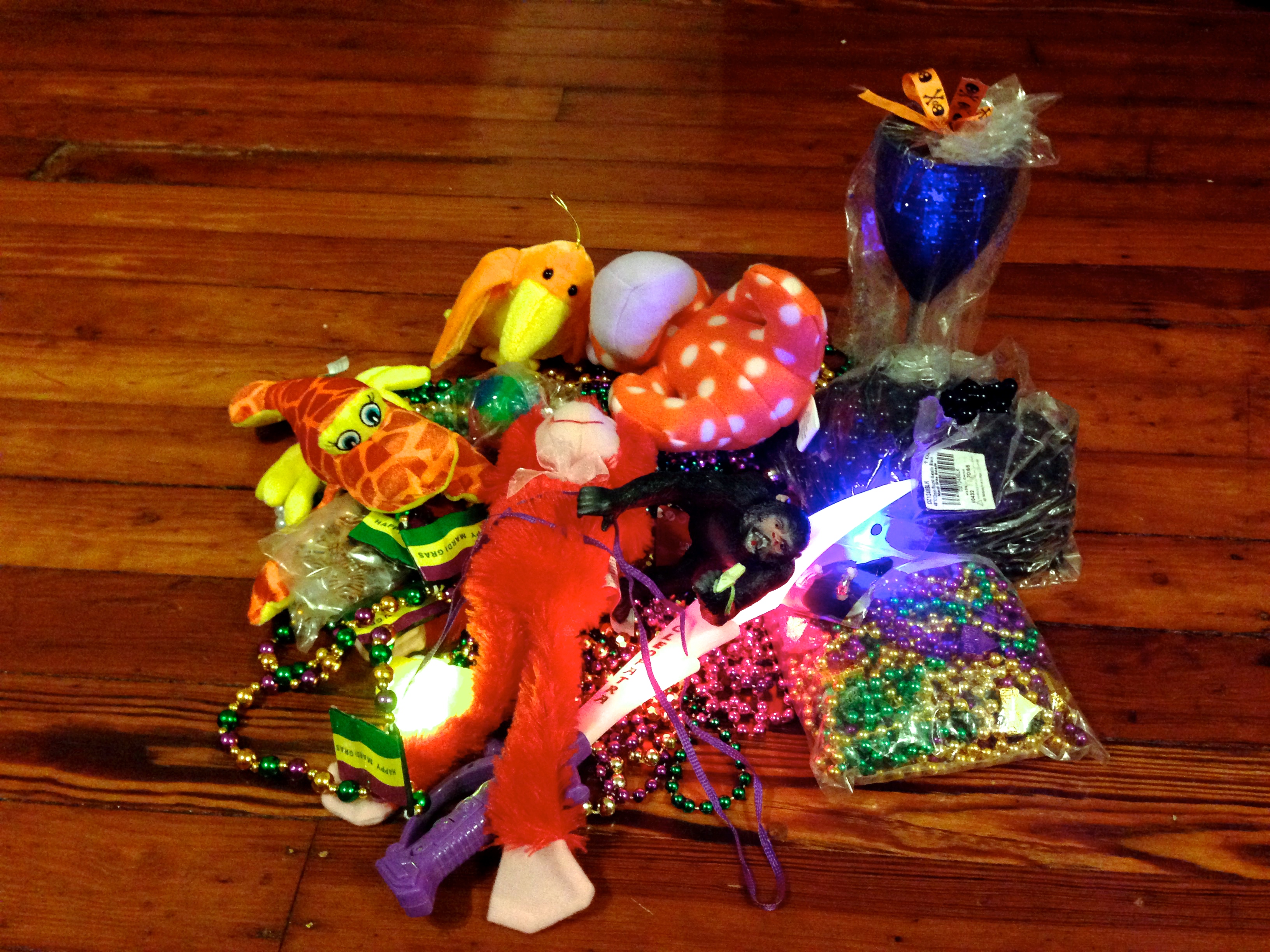 I had so much fun at my first Mardi Gras parade. It was kind of weird at first – basically these floats are passing by and you shout out “Throw me something!” and then the people on the float throw you something – or not. When they didn’t, it was so f*cking annoying! I’m really not into the whole “begging” aspect of it, but once I had a few drinks in me I got used to it. It was a lot of fun, and thanks to my friends, who gave me pretty much everything they caught, I ended up bring home a lot of stuff.