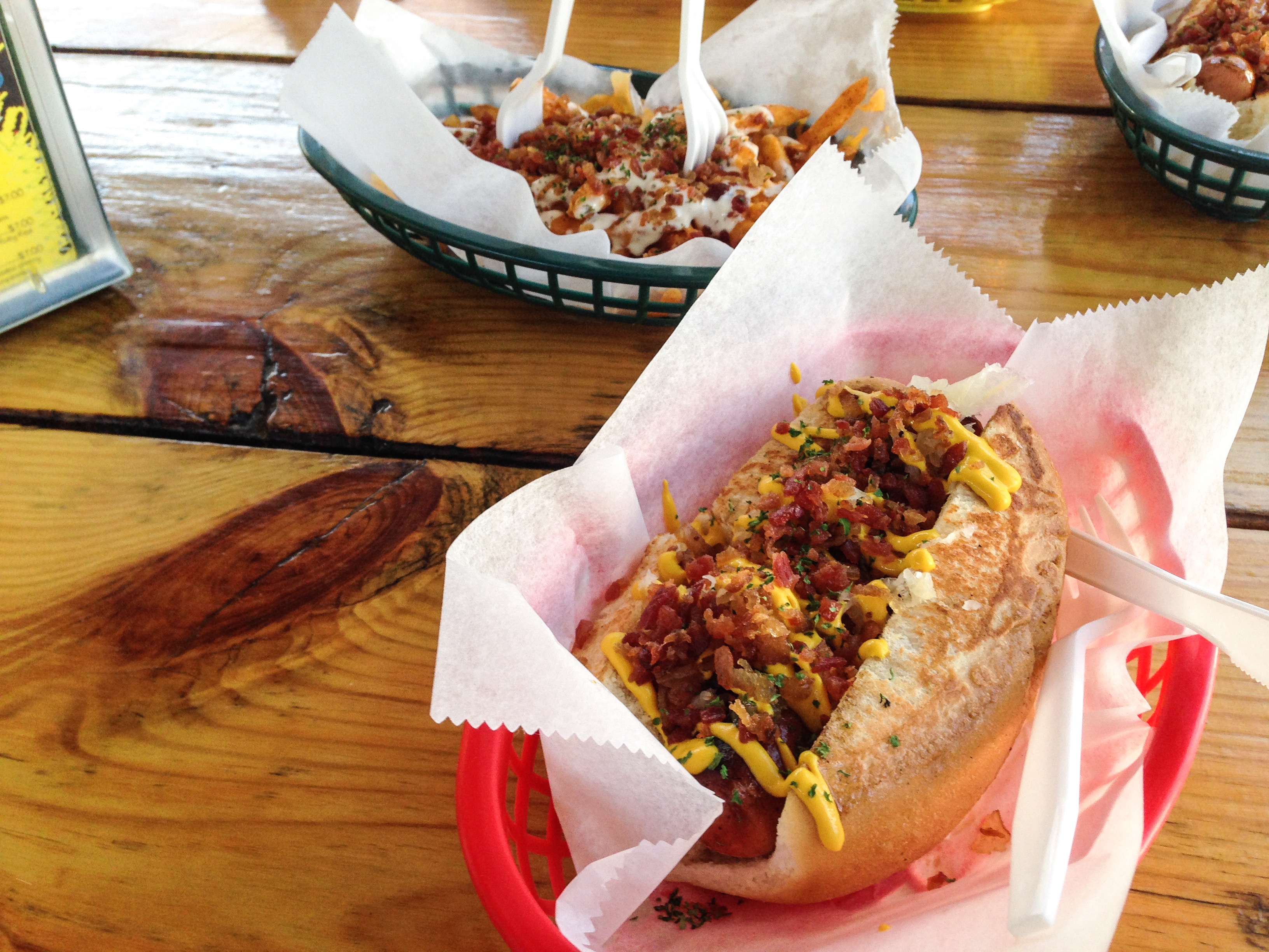 I get the same thing every time I eat there: Smoked bratwurst with sauerkraut and mustard (yesterday I added bacon because, well, it’s bacon). This meal always reminds me of when I was in Australia. Which is weird, considering I’ve been to Germany. But it reminds me of this German place Di and I ate at when we went to the Kuranda rain forest. It’s just a nice, happy memory of a beautiful day on vacation.